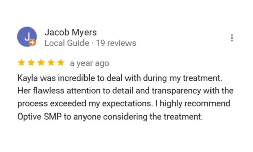 SMP is a non-invasive treatment, so there’s minimal downtime. Most people can return to regular activities immediately, although avoiding direct sun exposure, heavy sweating, and washing the scalp for a few days is recommended.