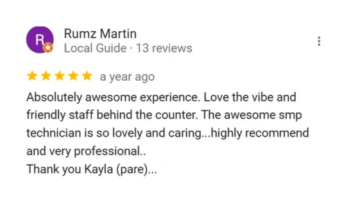 Most clients experience minimal discomfort, as SMP uses a smaller needle than traditional tattooing. We also adjust for your comfort during the treatment. Clients often describe the sensation as similar to light scratching.